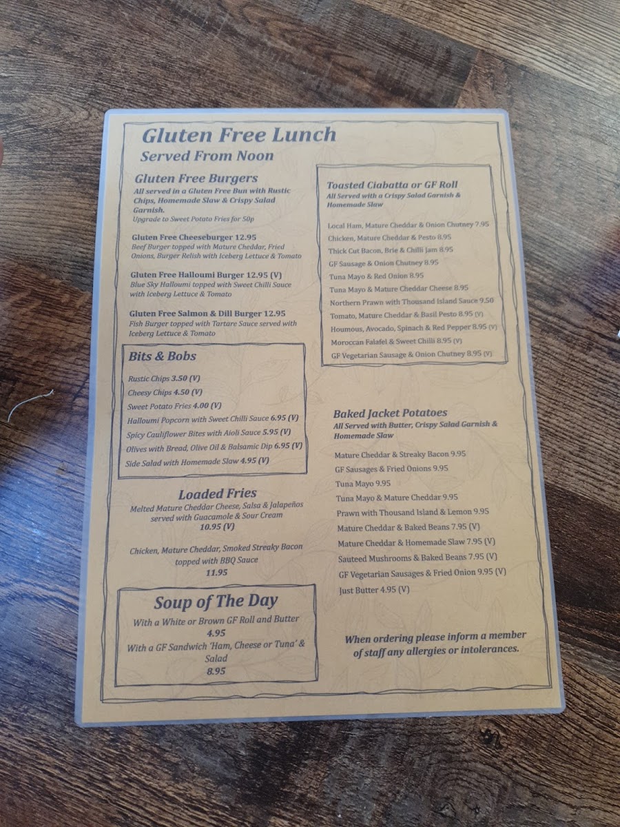 Guests can find a variety of options suited to different times of day—from warming mornings with a Mocca Latte or Hot Chocolate with Cream, to midday and afternoon snacks like the Small Seafood Platter or a slice of Coffee Cake. The menu also caters to those seeking fresher, lighter fare such as salads or jacket potatoes, alongside hearty specials like the Lamb Burger or Eggs Benedict.